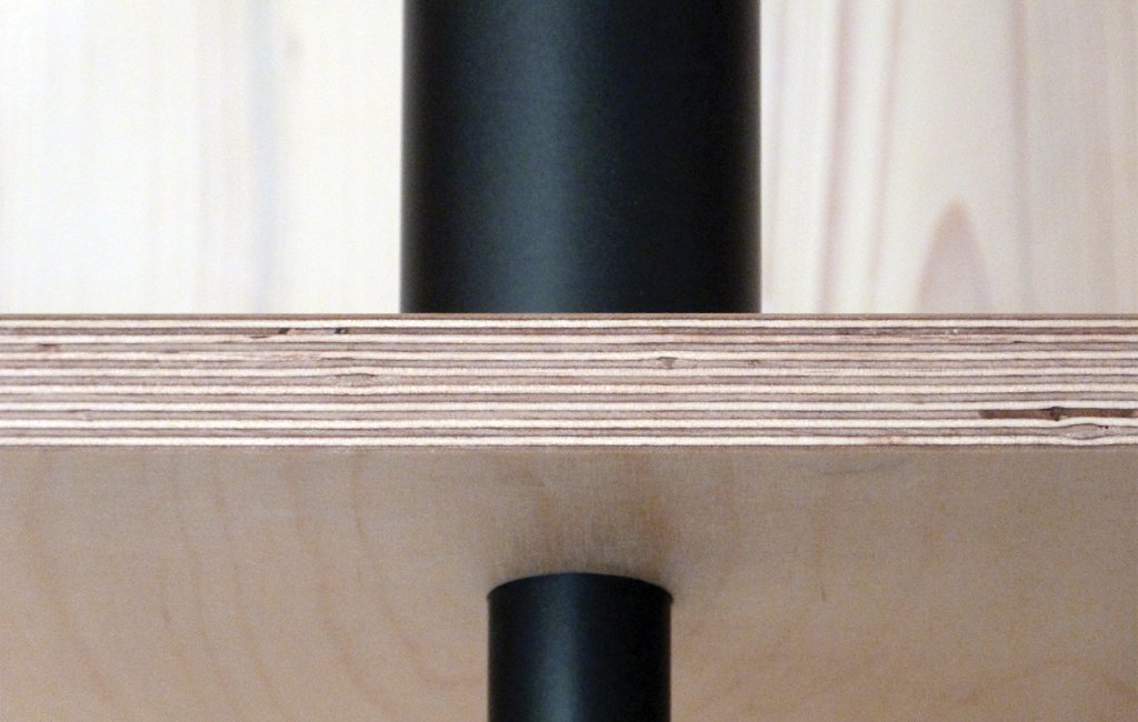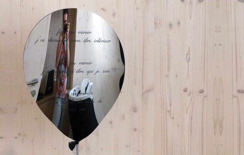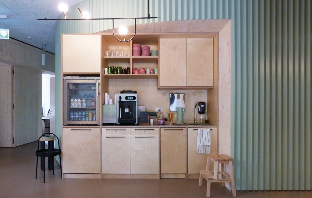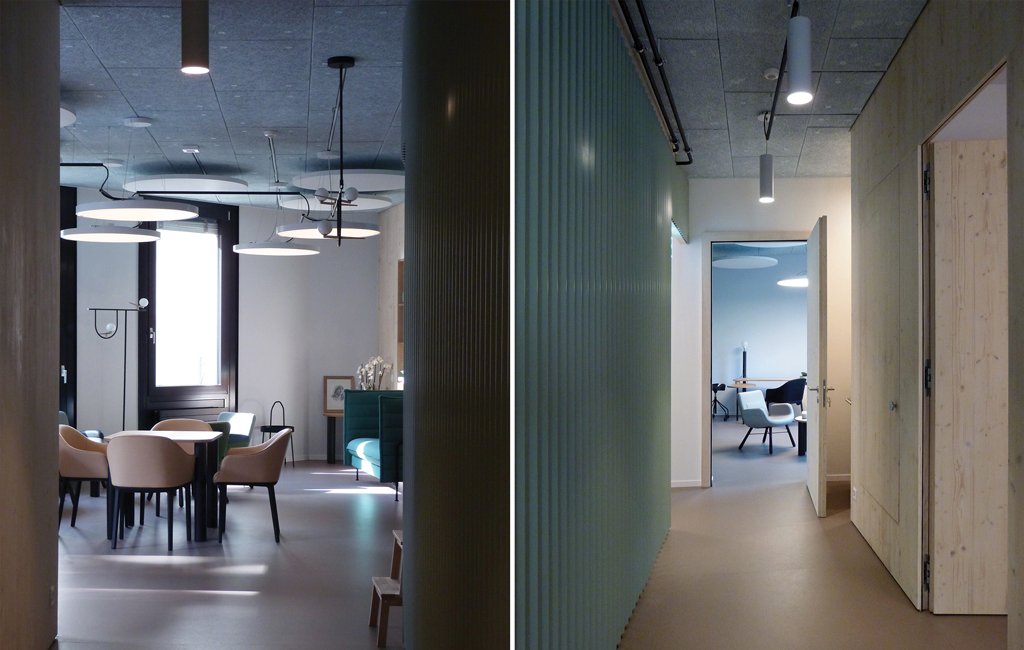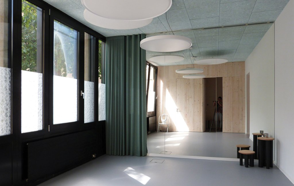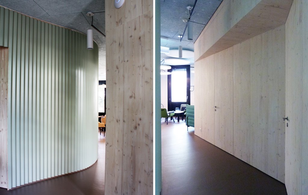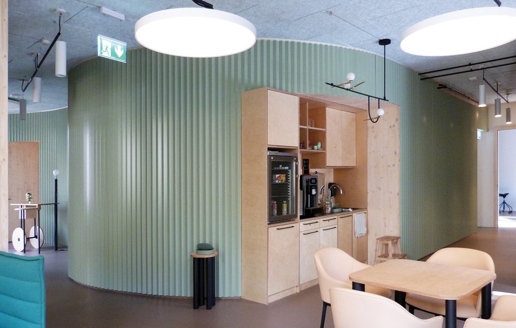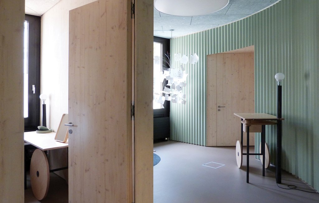La tôle verte ondulée qui recouvre le noyau central représente le re et des feuilles des arbres à la lumière du jour, accompagnant les visiteurs vers l’espace de vie. Le sol symbolise la terre, tandis que le plafond, recouvert de laine de bois et agrémenté d’îlots acoustiques, recrée l’ambiance du ciel. Des objets volants viennent compléter cet ensemble aérien, notamment une lampe suspendue s’apparentant à des oiseaux posés sur la branche d’un arbre.