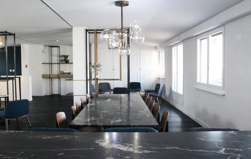 Cette transformation complète des combles inclut l’adaptation de l’enveloppe thermique, la rénovation des installations électriques, du système de chauffage et de ventilation ainsi que la réfection de la terrasse. Le projet décline l’identité de marque créée sur mesure, à travers une architecture d’intérieur de haut-standing.