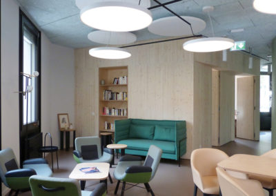 Le traitement des façades intérieures en bois naturel rappelle des cabanes en bois, associées à nos souvenirs d’enfance. Elles abritent ainsi les espaces de thérapie et de soins.